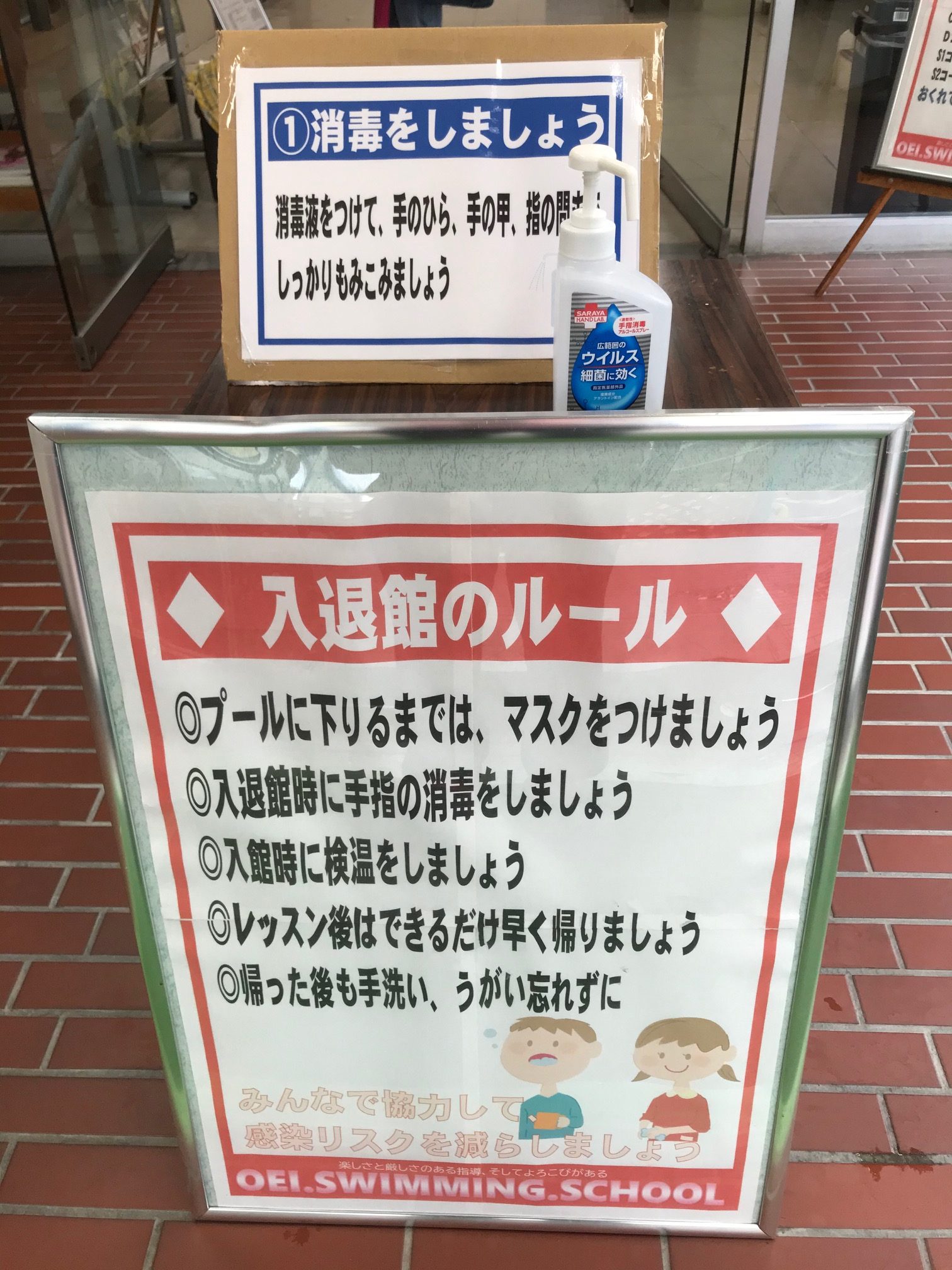 1.手指消毒をしましょう(入館時にはマスクも忘れずに!)
